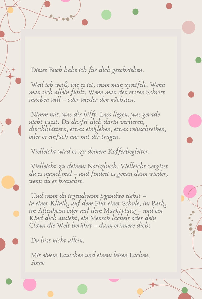 Ein inspirierendes, mit viel Herz und Gefühl geschriebenes Buch. Es erinnert daran, wie wertvoll echte Begegnungen sind und wie heilend ein Lächeln wirken kann. Für alle, die Clowns lieben, mit Menschen arbeiten oder sich einfach von Herzensgeschichten berühren lassen möchten – eine klare Empfehlung!